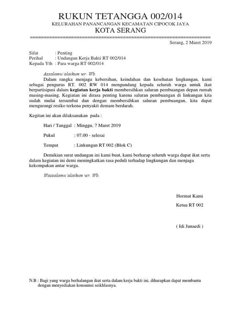Demikianlah undangan ini kami buat dan atas perhatiannya kami ucapkan terima kasih. September 17 at 3:31 pm · makassar, indonesia ·. Lingkungan rt 01 acara : Please download to get full document. Kerja bakti adalah suata sarana kebersamaan antar warga guna membantu tercapainya kenyamanan desa dengan melakukan pemba.