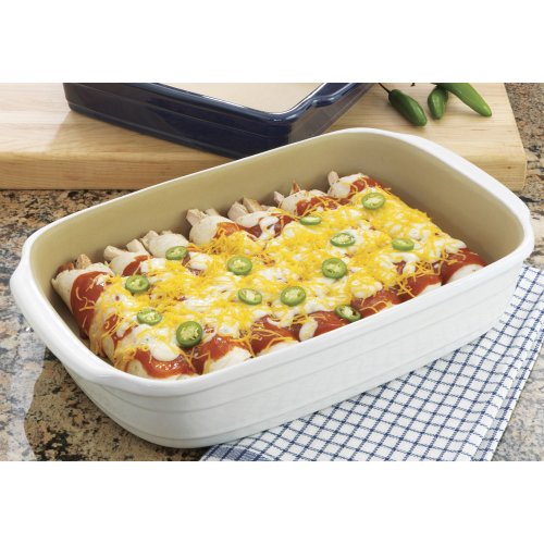 Rectangular baking dish is suitable for oven to table serving stoneware ceramic dish with wide and comfortable handles features a vitreous glass porcelain finish