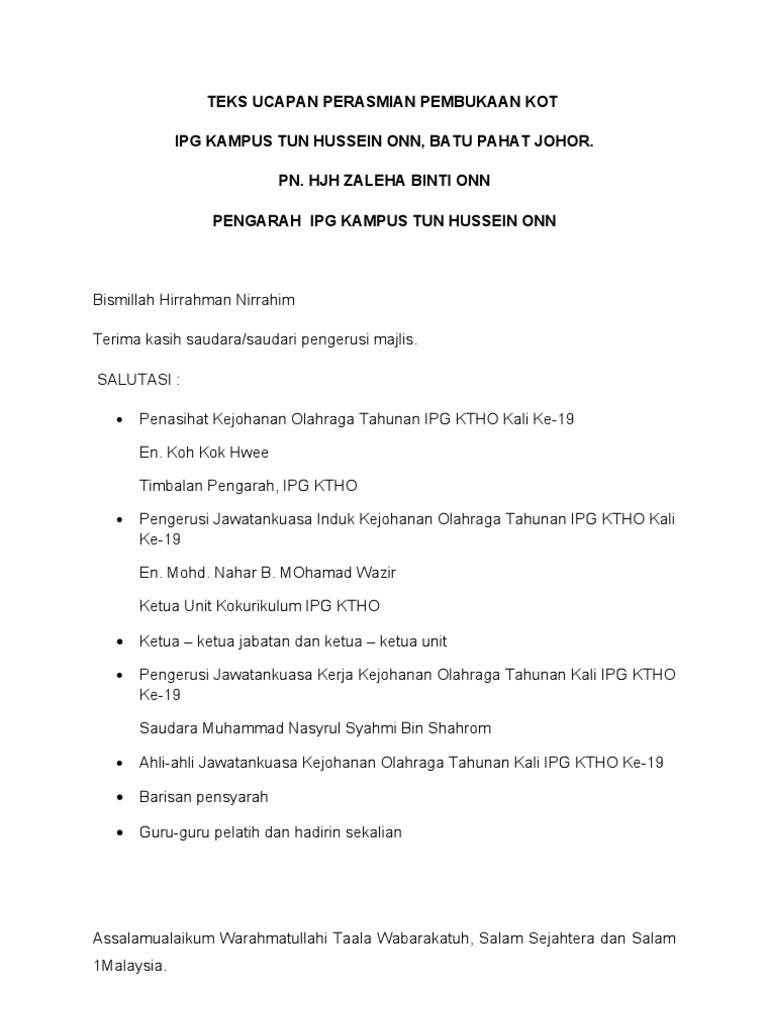 Teks ucapan Perasmian from imgv2-2-f.scribdassets.com Pengerusi puspanita jajahan gua musang. Yang berhormat en charles o pang su pin. Dijemput dgn segala hormat , yang berusaha pn siti hawa bt abd majid, gpk akademik smk dato mohd taha utk menyampaikan ucapan seterusnya merasmikan bulan bahasa peringkat sekolah bagi tahun 2017. Teks ucapan perasmian mesyuarat agung pibg. Pakej rangsangan ekonomi 2020 memperkukuh keyakinan, merangsang pertumbuhan Beberapa ucapan terimakasih di atas bisa dijadikan referensi untuk anda yang bermaksud menuliskan atau menyampaikan terimakasih kepada orang lain, baik itu. Ucapan penghormatan merupakan sebuah ucapan yang disampaikan oleh seseorang yang satu pesanku untuk kalian jadilah adik adik yang baik. Sejajar dengan itu, wanita masakini telah mencapai satu tahap yang terbaik dalam banyak aspek kehidupan sama ada teks ucapan.