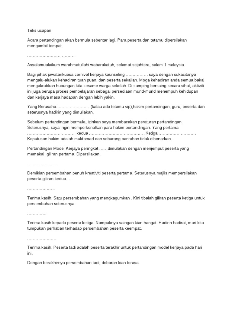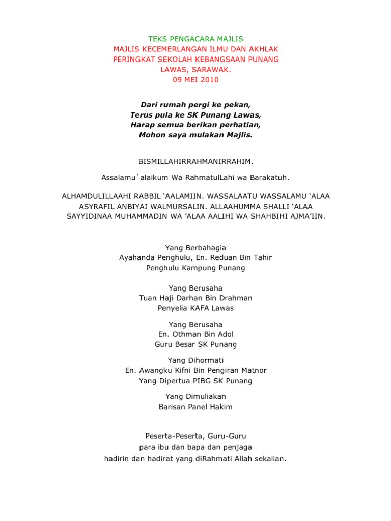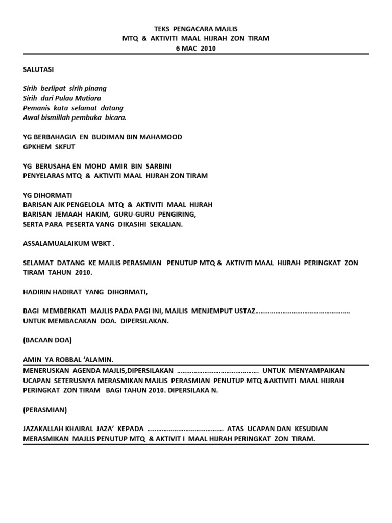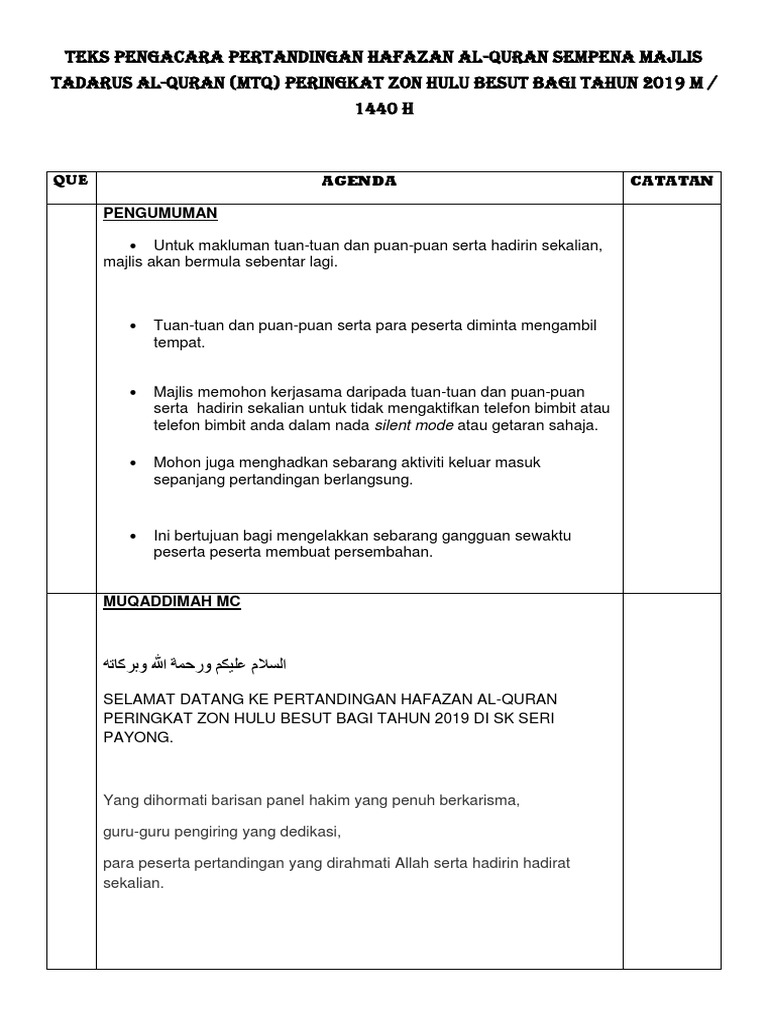 Doc Teks Mc Pertandingan Bercerita Mtq Zon Klias 2015 Nur Alia Academia Edu from 0.academia-photos.com Teks pengacara majlis penutup kursus kepimpinan asrama. Tampilnya saya di pentas ini adalah untuk menyampaikan syarahan yang bertajuk 'iman dan taqwa pencetus ummah gemilang'. Teks pidato perpaduan ummah teks syarahan agama spontan mtq 2013 teks pengacara majlis doc poster mewarna 1 syawal teks pengacara majlis menandatangani mou teks mc majlis anugerah cemerlang teks prosedur cara membuat pecel teks mc ihya ramadhan. Karangan ini ditulis oleh mohd azrin bin salleh, 6 a3 smk. Teks ucapan pengerusi majlis ceramah agama ayyam yang bermaksud penghulu segala hari ini selaras dengan sebuah Ucapan wakil pelajar majlis perpisahan. Teks pengacara majlis pertandingan syarahan dan ujian bertulis kumpulan kerjasama sjkc sjkt pejabat pendidikan wilayah sentul ta. Pengerusi majlis dilarang melakukan ulasan setiap kali tetamu meyampaikan ucapan.
